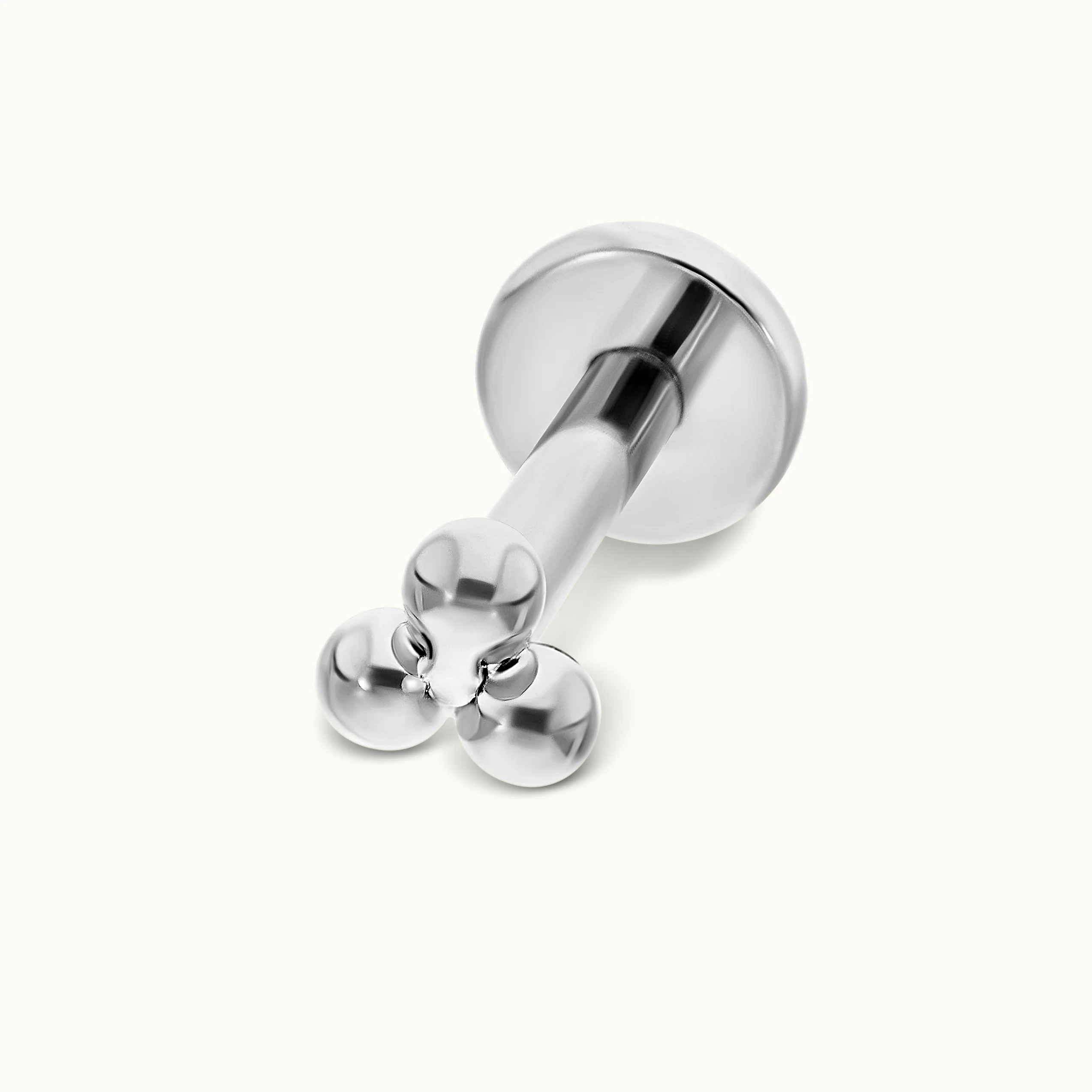 Trinity. L'élégance minimaliste par excellence. Son trio de billes polies offre un relief subtil, idéal pour sublimer un Tragus ou un Hélix avec discrétion. Conçu pour durer, ce classique intemporel sécurise votre perçage grâce à sa qualité grade implantable.