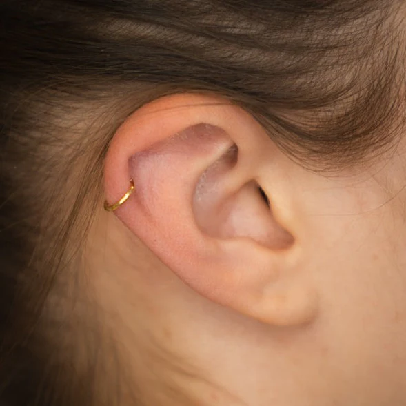 L'Anneau Or 14K. L'essentiel lumineux incontournable. Son design minimaliste capte délicatement la lumière pour apporter une touche de chaleur immédiate à un Daith ou un Hélix. Doté d'une charnière de précision sur titane, il garantit une fermeture sécurisée et une élégance durable..