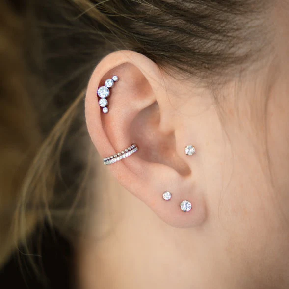 Mintika. Sublimez votre oreille grâce à un arc délicat de cinq cristaux scintillants. Conçu pour épouser parfaitement la courbe naturelle d’un Hélix ou le creux d’un Conch, ce design capte la lumière avec finesse. Son titane grade implantable assure une tolérance optimale.