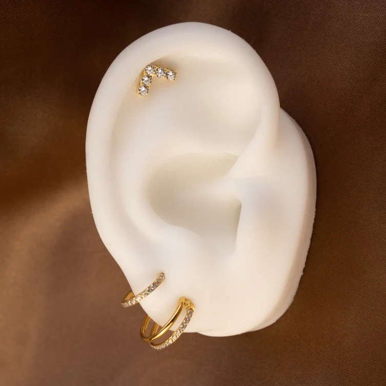 Nekkar. L'illusion parfaite d'une accumulation sophistiquée. Son design double rang allie l'éclat intemporel des zircons à une ligne lisse en titane pour illuminer votre Hélix ou Conch. Son fermoir clicker assure une sécurité absolue et une manipulation aisée au quotidien.