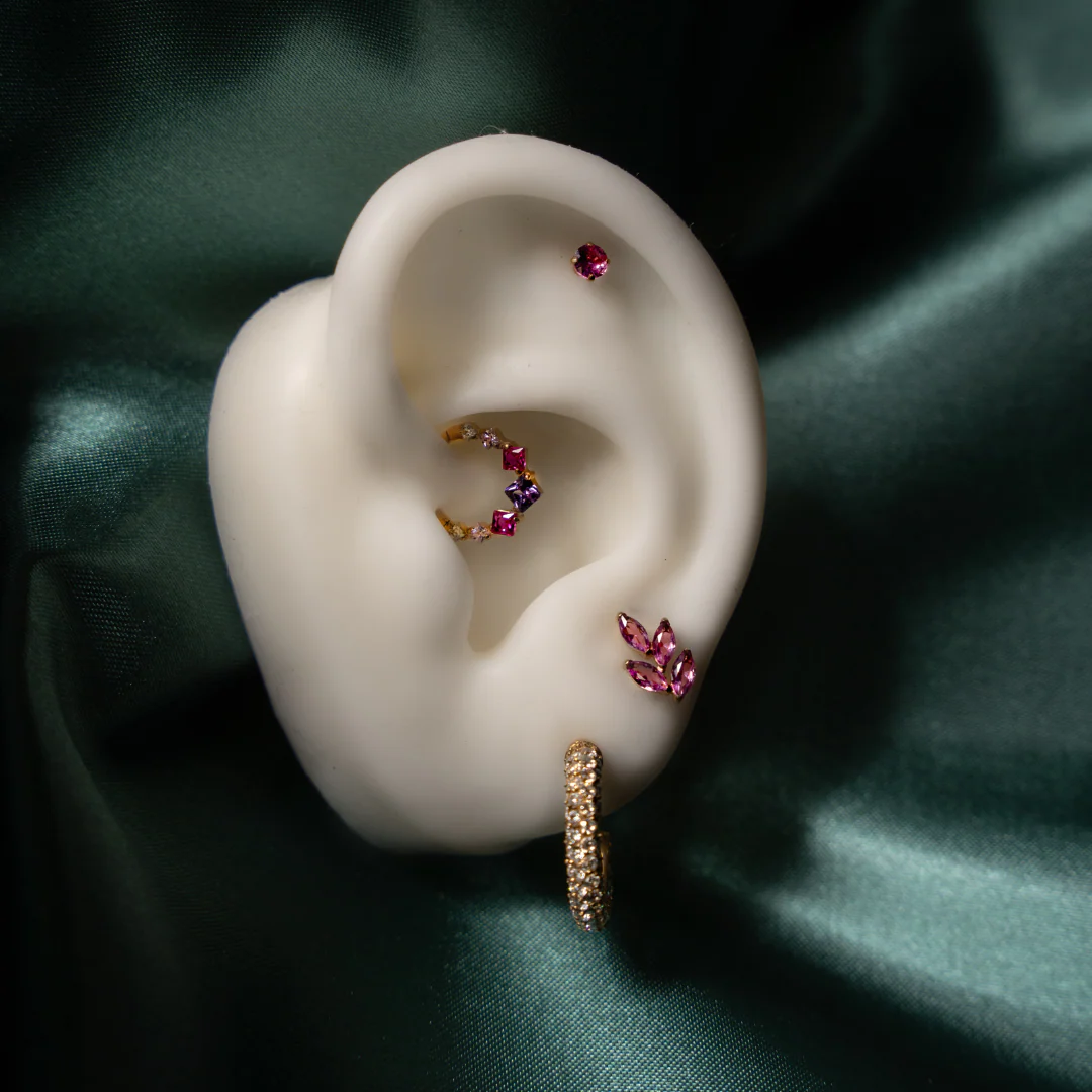Rossini. Un dégradé audacieux de couleurs. Sa structure angulaire ornée de cristaux roses et mauves apporte une touche moderne à votre composition. Idéal pour un Septum ou un Daith, ce bijou en titane assure un style sophistiqué et une sécurité absolue grâce à son fermoir clicker.