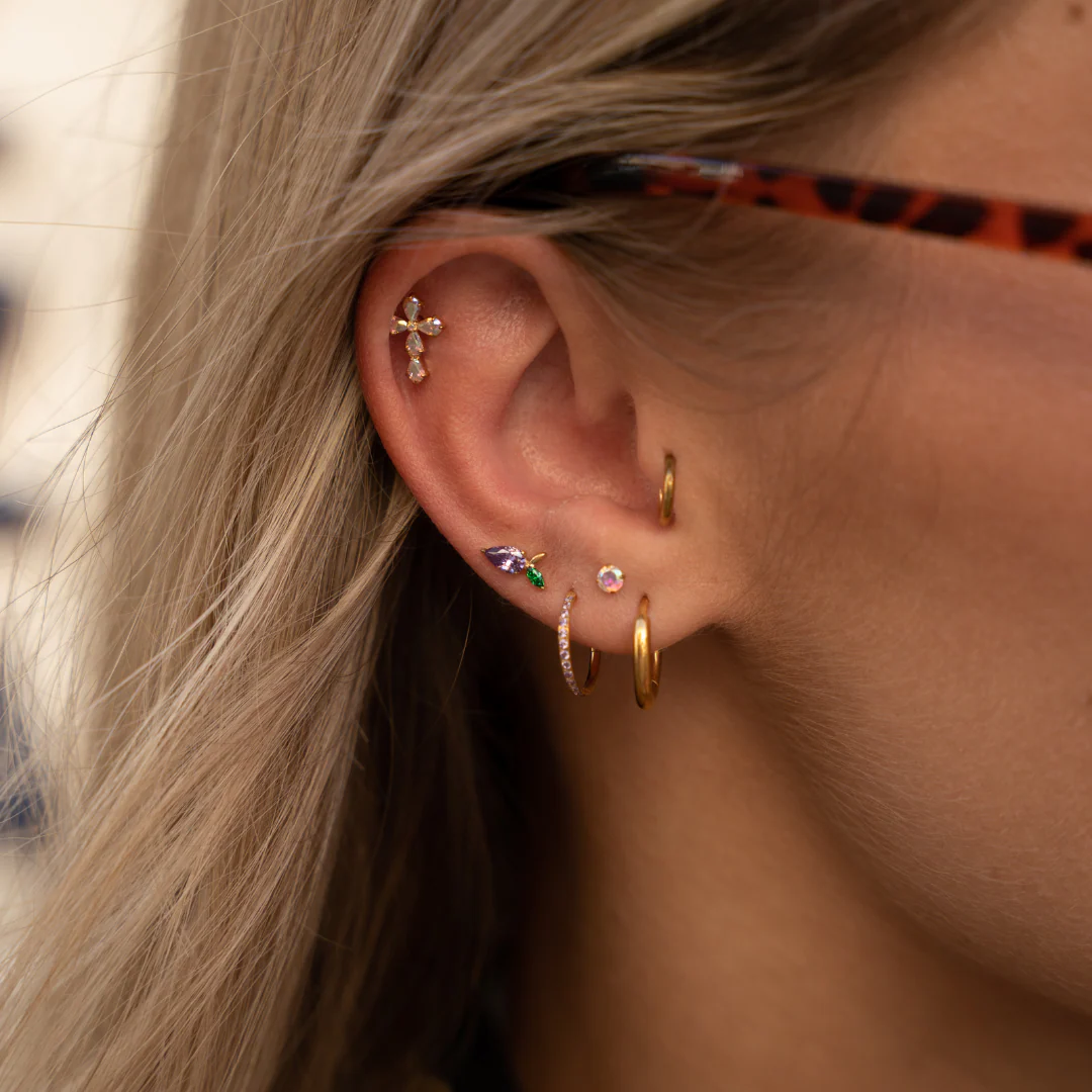 Spritz. L'audace s'invite à votre oreille avec ce design en croix spectaculaire de plus de 10 mm. Décliné en Orange intense ou Holographique envoûtant, ce bijou en titane doré PVD sublime instantanément un Flat ou un Lobe. Il allie un style affirmé à la sécurité absolue du grade implantable pour un confort quotidien.