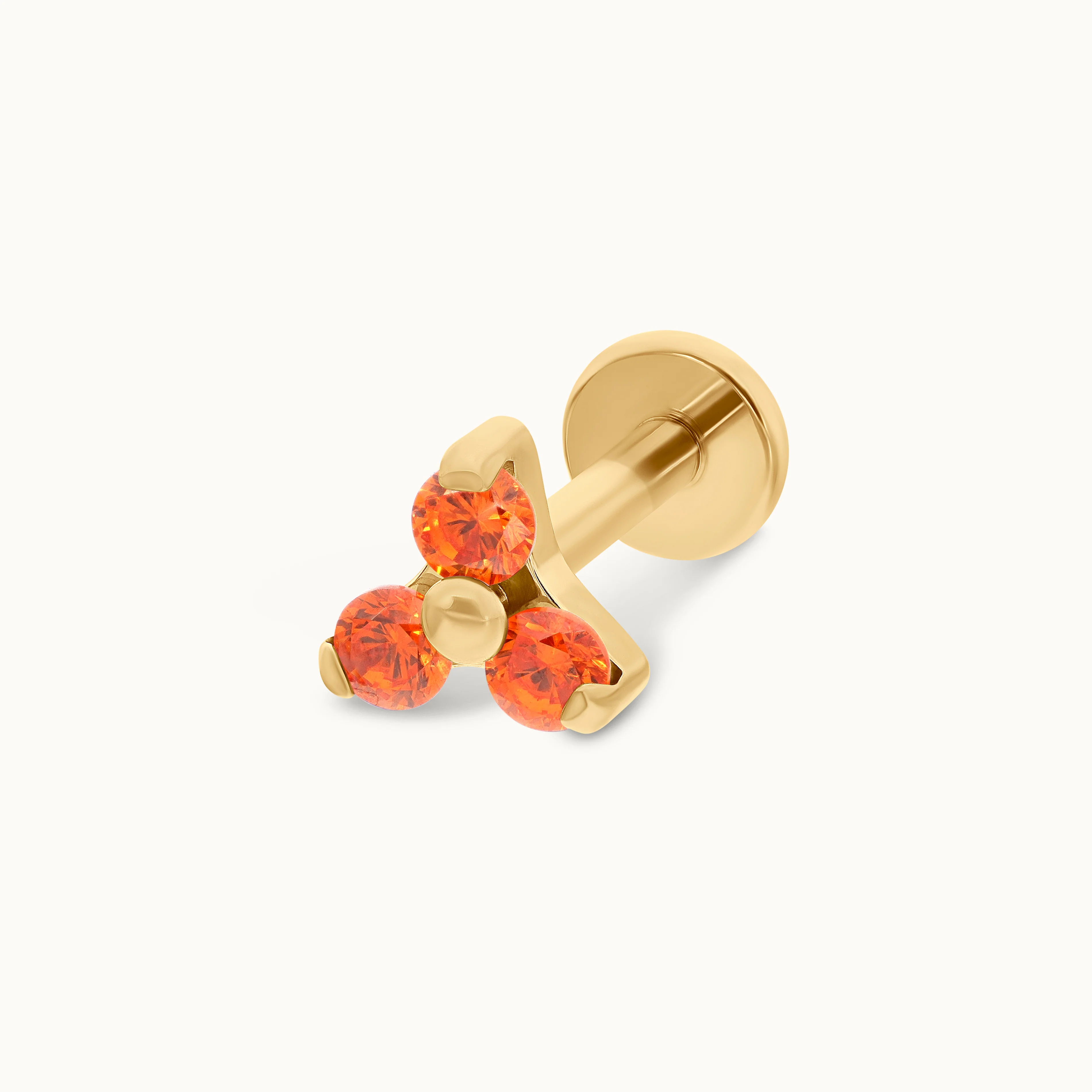 Trinity Basta Cosi. Sublimez votre oreille avec trois zircons vibrants : fuchsia, mauve ou orange. Avec son diamètre de 5 mm, ce design lumineux habille idéalement un Hélix ou un Tragus. En titane grade implantable, il assure une sécurité optimale grâce à son vissage interne.