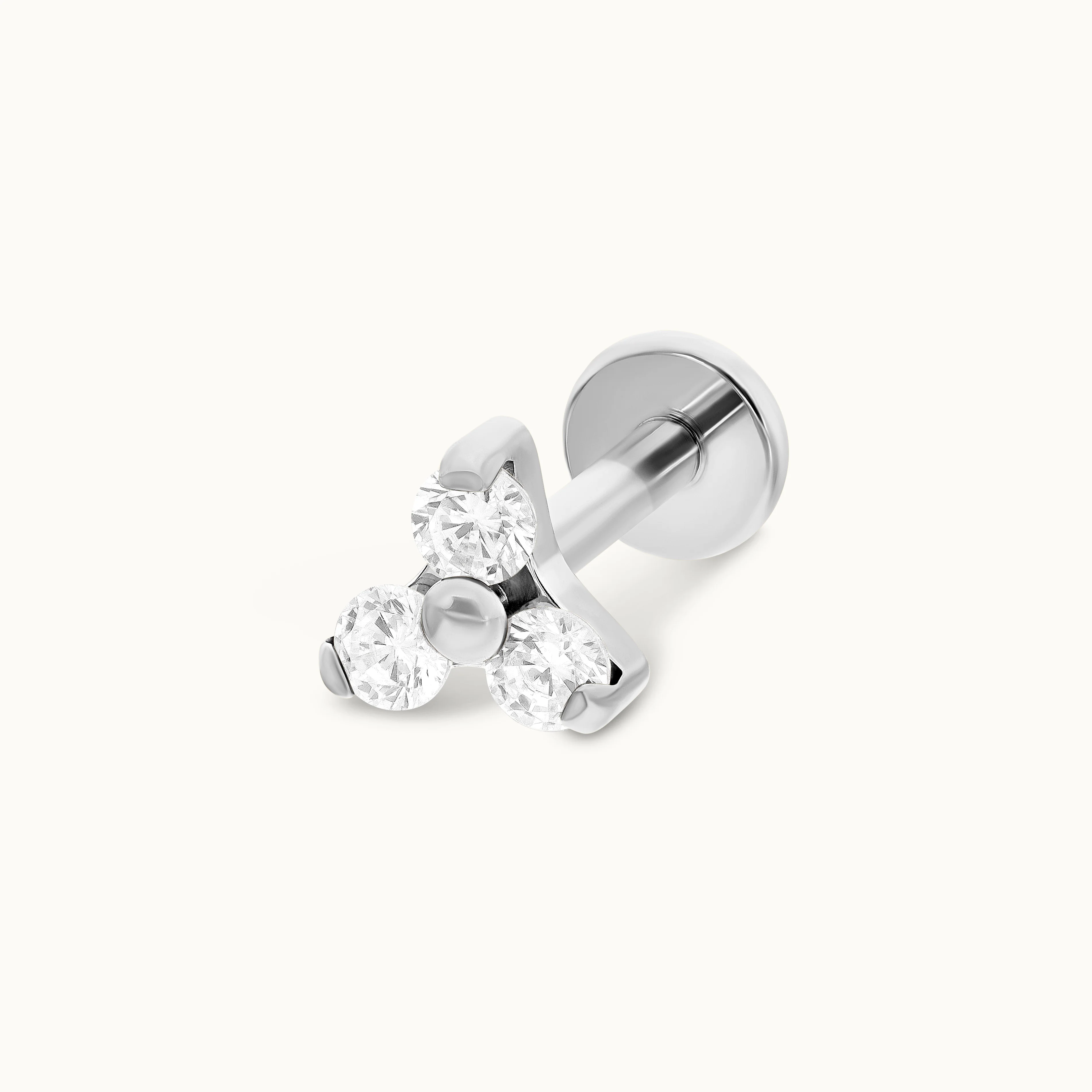 Trinity Zircon. Un concentré de lumière en forme de trèfle. Ses trois oxydes de zirconium scintillants subliment instantanément un Hélix ou un Tragus. L'équilibre parfait entre discrétion et éclat, monté sur une base titane pour une sécurité absolue et un confort durable.